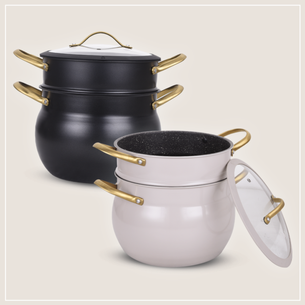 סיר קוסקוס בסדרת מארקש מיוצרת מאלומיניום בתהליך ALUMINUM – PRESS, בציפוי פנימי NON STICK המונע הדבקה.