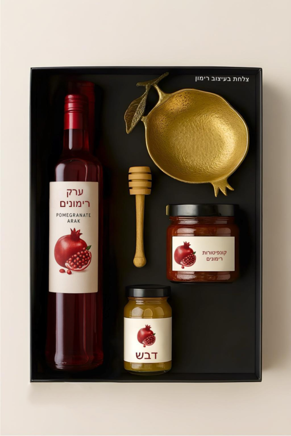 / ערק רימונים משובח עם דבש ורימונים + צלחת בצורת רימון + כף לדבש