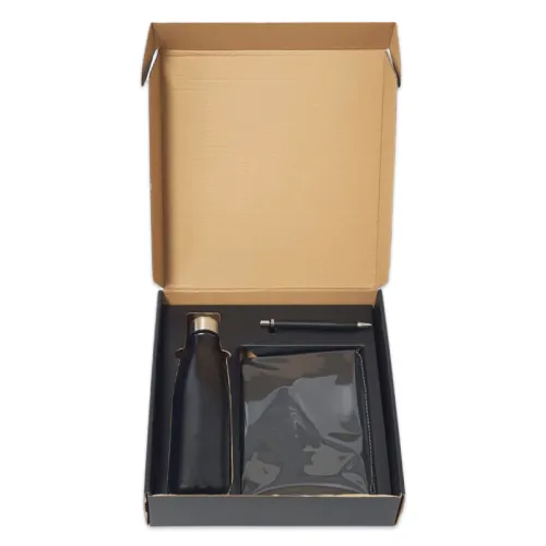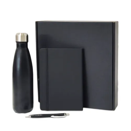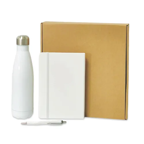 סט מתנה מושלם הכולל מחברת A5 דמוי עור בקבוק שומר חום או קור 500 מ"ל ועט ג'ל גודל קופסא 28.5X29X7 ס"מ הבקבוק הלבן מתאים להדפסת סובלימציה