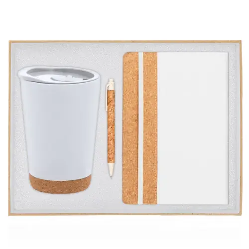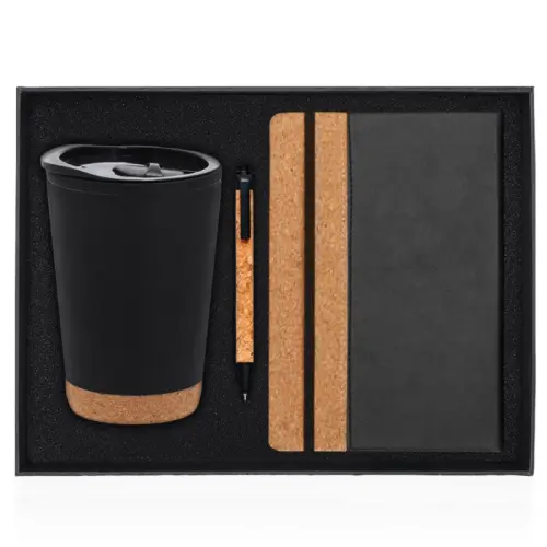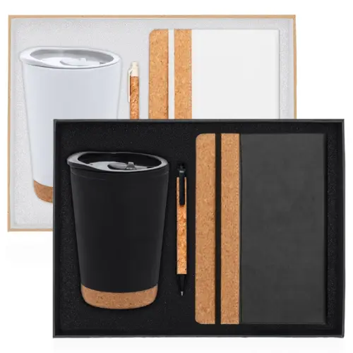 סט מתנה מושלם הכולל מחברת A5 מעוצבת בשילוב שעם ספל תרמי מעוצב בשילוב שעם 330 מ"ל ועט ג'ל בשילוב שעם במארז מתנה