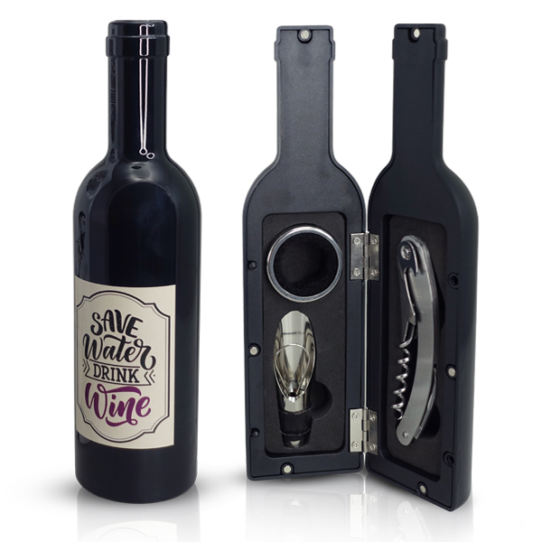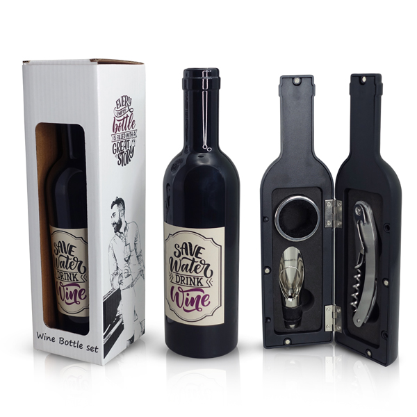 "וינו" סט אביזרי יין במארז מפואר דמוי בקבוק יין הכולל: פותחן , פקק עם סוגר וטבעת למניעת טפטופים