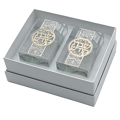 / זוג פמוטי קריסטל מרובע עם פלקטה "הדלקת נרות" 8 ס"מ