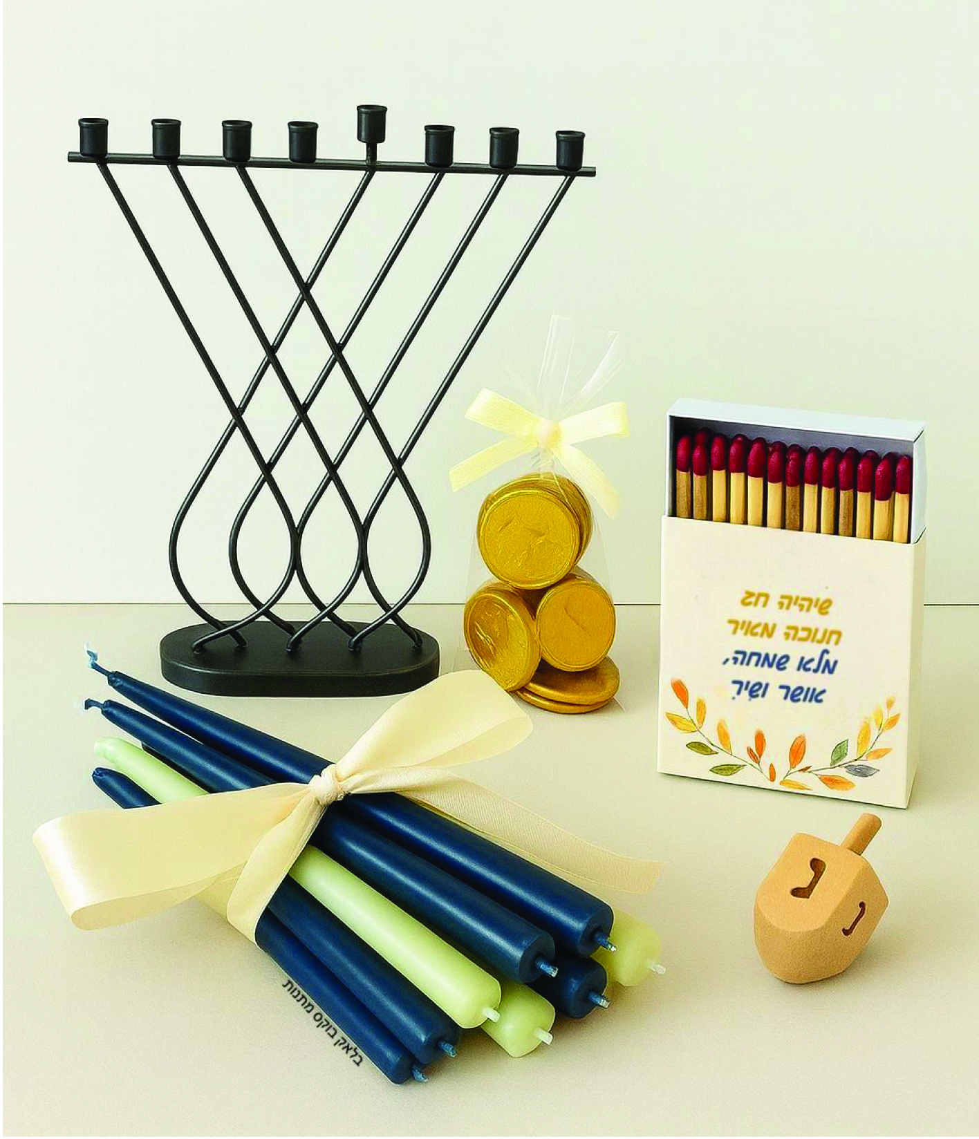המארז כולל: * חנוכייה מעוצבת ממתכת * מארז נרות חנוכה בקופסה שקופה * קופסת גפרורים ארוכים * שקית מטבעות שוקולד * סביבון