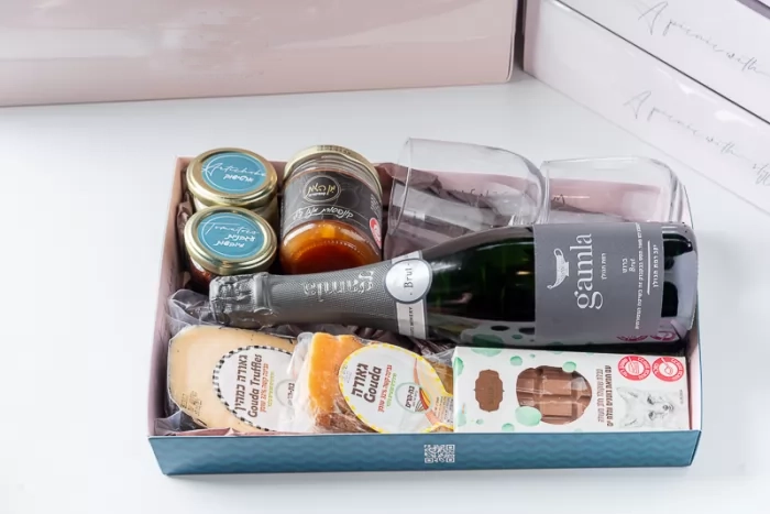 המארז מכיל יין מבעבע קרווה צנצנת זיתים צנצנת ריבה טבלאת שוקולד בוטיק 2 כוסות יין ללא רגל ריבת בוטיק ארצישראלית 2 גבינות קשות 150 גרם
