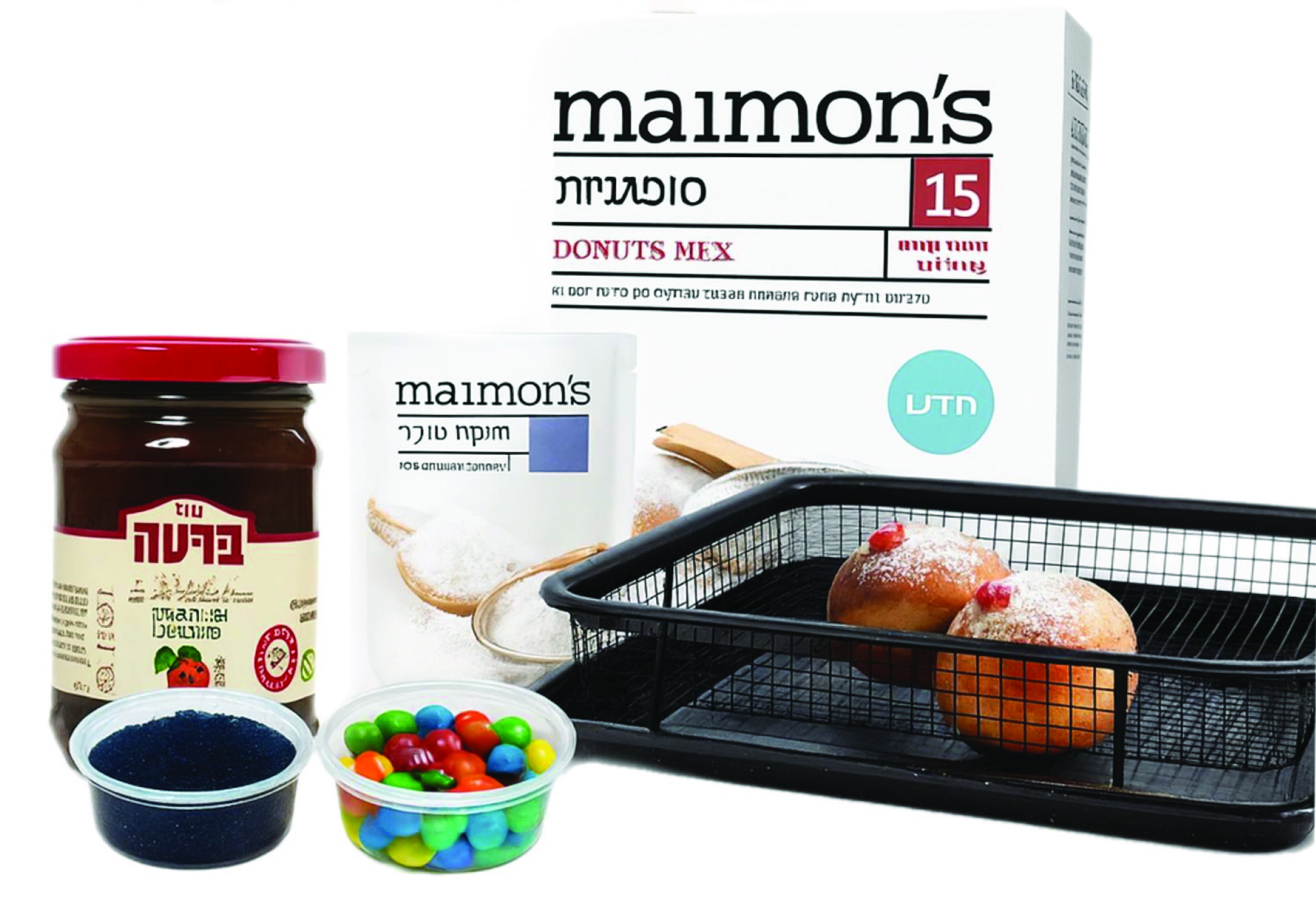 * קריספר נירוסטה איכותי 30/22 הכולל מסננת טיגון * תערובת להכנת סופגניות 650 גרם * אבקת סוכר * קונפיטורת תות שדה * 2 קופסאות סוכריות תוספות לקישוט הסופגניות ארוזים בקופסה מעוצבת ומיוחדת