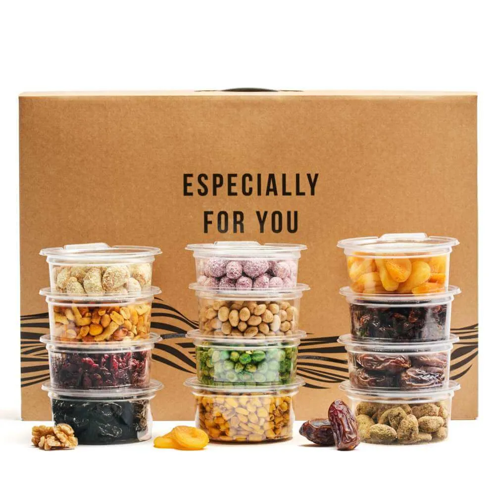 - מארז שי במכיל בתוכו 12 קופסאות אחסון איכותיות מלאות פירות יבשים ופיצוחים: