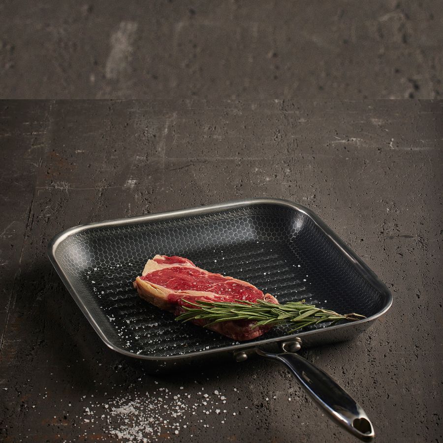 סדרת HYBRIDPAN מציעה כלי בישול היברידיים עם משטח בישול HEXACOMB חזק ועמיד בפני שריטות.