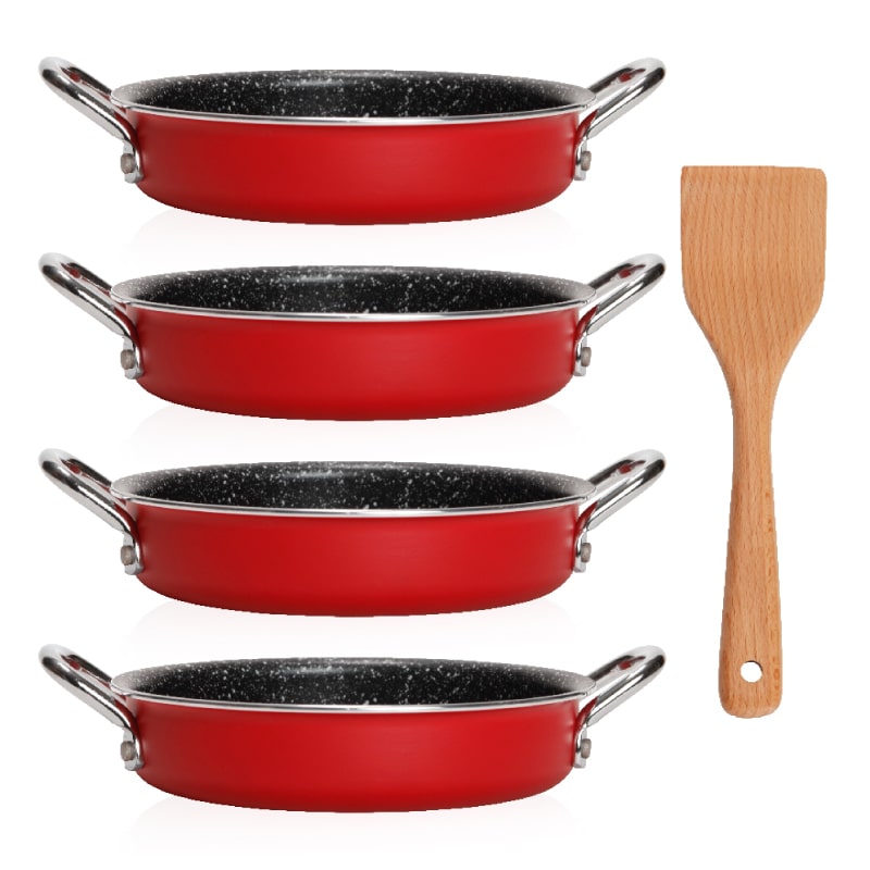 סט שקשוקה להכנת שקשוקה ביתית מושלמת הסט כולל 4 מחבתות אישיות קוטר 16 ס"מ מתאימות לכל סוגי הכיריים עם ציפוי NONSTICK בתוספת מרית עץ במארז מתנה