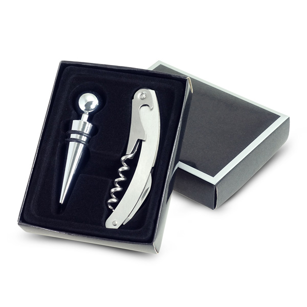 "סנגריה" סט יין מעוצב באריזת מתנה הכולל: פותחן בקבוקים ופקק מתכתי לסגירת בקבוקי יין