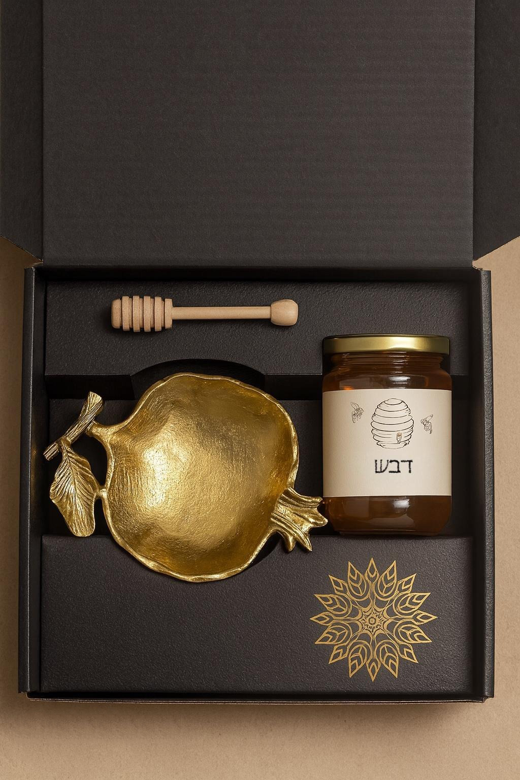 BB צלחת רימון מוזהבת עבודת יד, דבש טהור, ומקל דבש ארוזים בקופסא