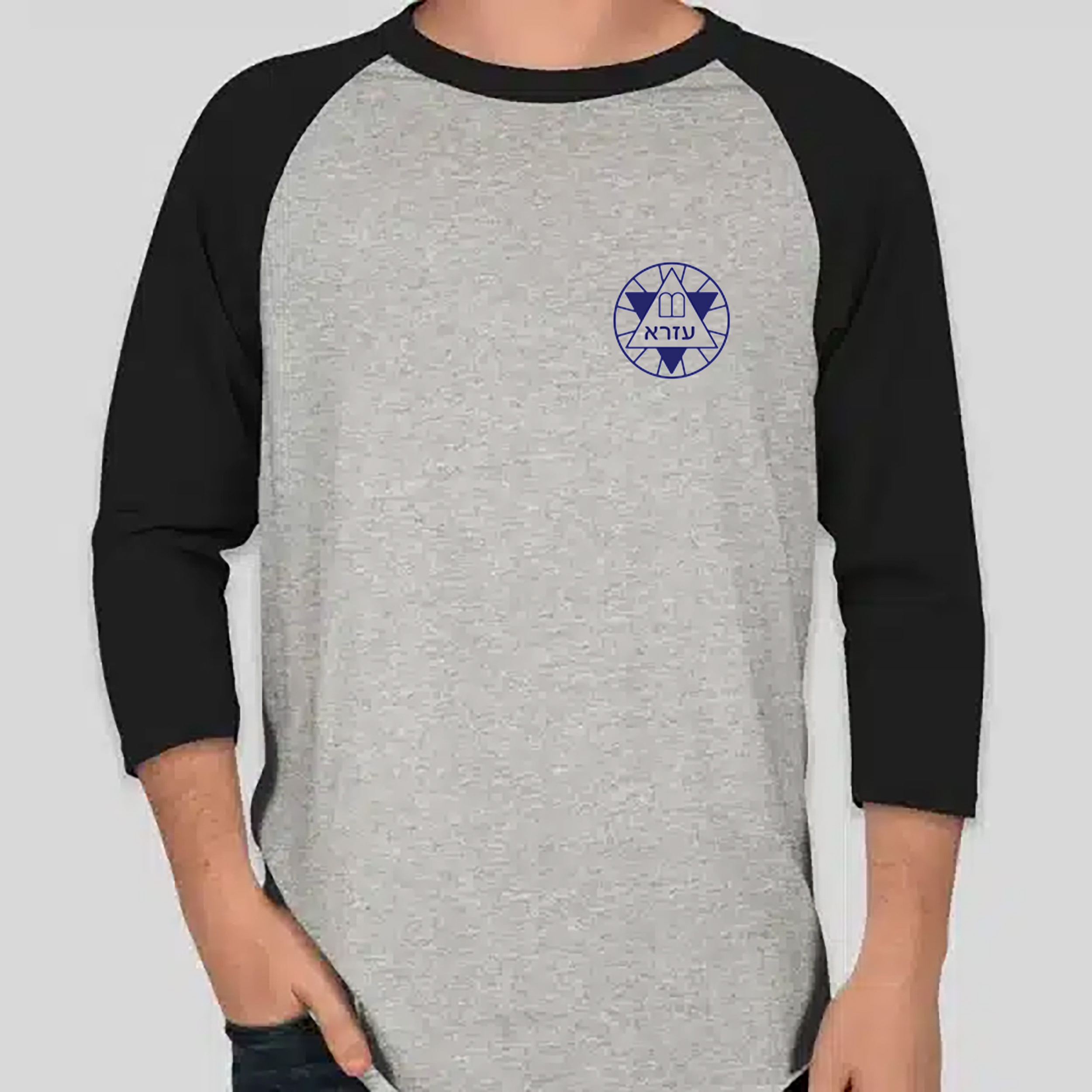 גזרה: צווארון עגול שרוול 3/4 גזרת גברים חזה אפור מלאנג' אמריקאי ושרוולים באורך 3/4 שחורים