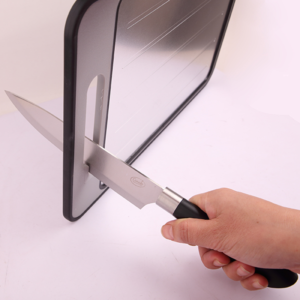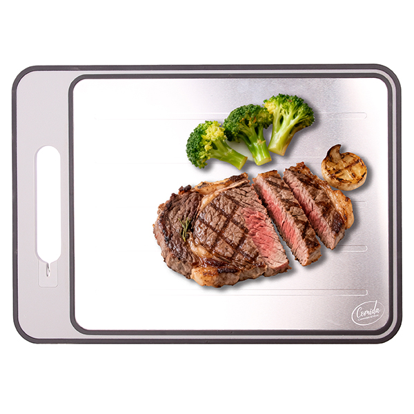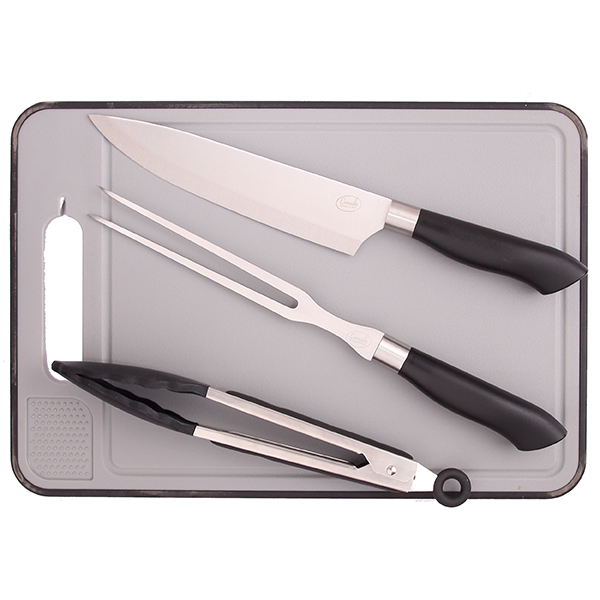 "Comida" סט 4 חלקים למטבח כולל משטח הפשרה/לוח חיתוך סכין שף, קילשון, מלקחיים, משחזת מובנת, מגרדת שום